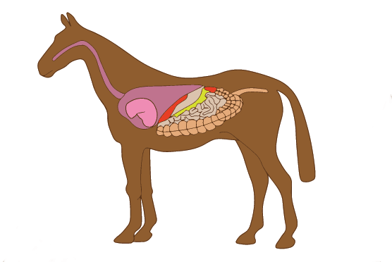 Son système digestif est primairement conçu pour digérer et valoriser le fourrage (fibres). Le cheval possède donc un petit estomac et un petit intestin grêle mais un gros intestin très développé (environ 60% du volume total du tractus digestif), véritable usine à énergie.